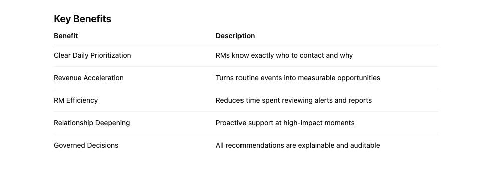These recommendations are delivered directly into RM and branch workflows, enabling immediate execution.